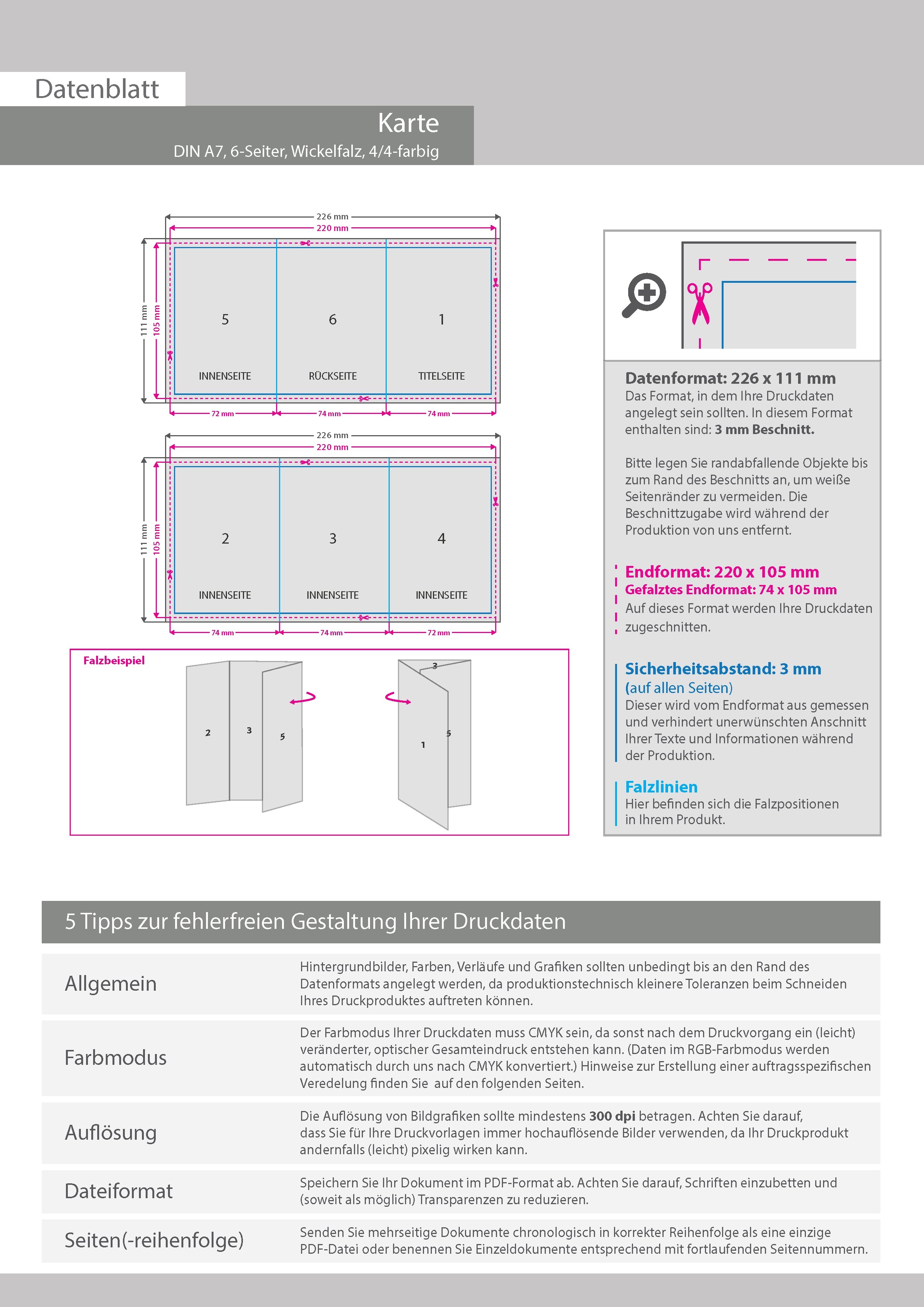 Einladungskarte, gefalzt auf DIN A7, vertikaler Wickelfalz, 6-seitig