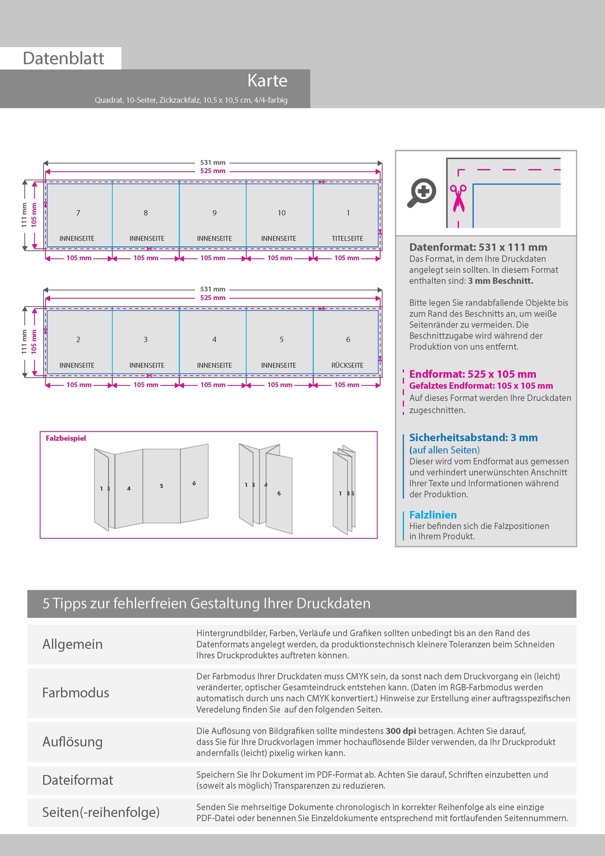 Hochzeitskarte, gefalzt auf Quadrat 10,5 cm x 10,5 cm, vertikaler Zickzackfalz, 10-seitig